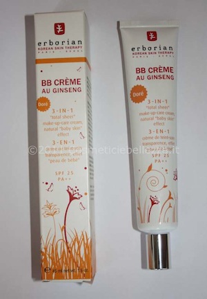 La BB Cream Erborian contiene un’elevata concentrazione di erbe, come appunto il ginseng, utilizzate da millenni in Asia per le loro innumerevoli virtù, fra cui anche quelle di rendere la pelle radiosa e combattere i segni del tempo. La caratteristica principale di questa crema è infatti di regalare una “pelle da bambino”: morbida e vellutata al tatto, e dall’aspetto sano e compatto. La dicitura 3 in 1 che si vede sul tubetto, indica che ha una triplice azione: crema idratante, fondotinta e correttore. Ha inoltre un fattore di protezione alto, spf 25 e la durata è di 12 mesi. Questa crema promette una tenuta perfetta di 12 ore sul viso, ed è disponibile in due tonalità: Claire (chiara) e Dorè (dorata).