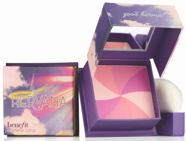 è esattamente come ce lo aspetteremmo da un prodotto di Benefit: ovvero carinissimo, e curato nei minimi particolari! E’ contenuto nella classica scatolina quadrata di cartoncino, dai colori rosa e viola, con delle nuvolette che richiamano l’idea di un cosmetico “celestiale” e “angelico”. Hervana è nato infatti per regalare ad ogni donna un colorito delicato e fanciullesco, quasi impalapabile. Sul retro sono riportati tutti gli ingredienti, e le istruzioni d’uso in varie lingue. Su un lato della scatola appare la scritta: “Good Karma!”, di buon auspicio direi!