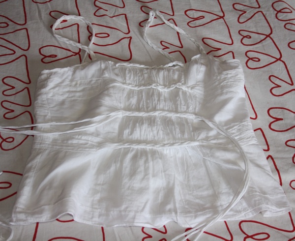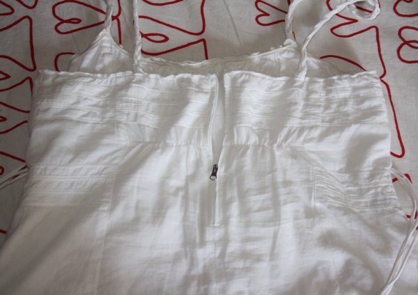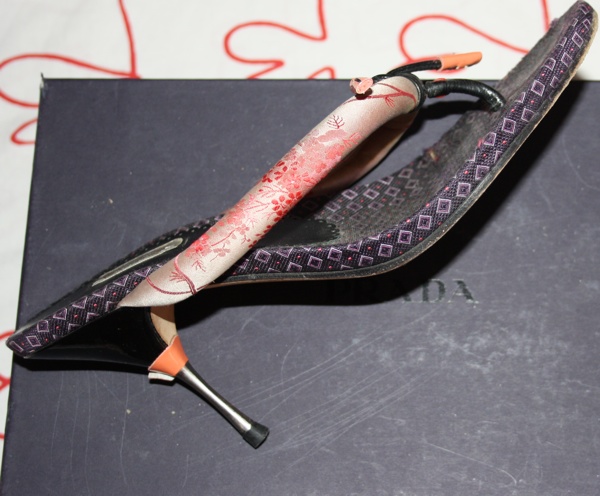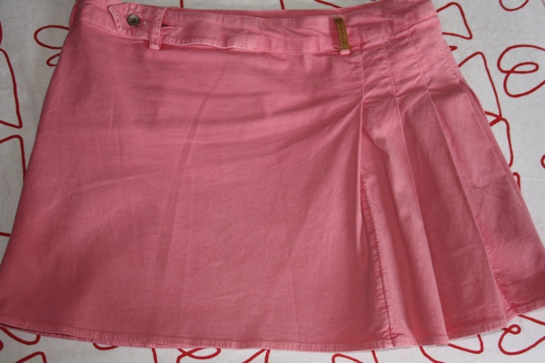 Ecco allora che mi è venuto in mente un outfit semplicissimo, ma molto fresco e sbarazzino, composto da un top di cotone bianco e una minigonna in jeans rosa fragola. Il top è in cotone leggero, con spalline intrecciate a cordoncino, e una serie di fettuccine da legare dietro la schiena. La particolarità della gonna è di essere asimmetrica, con una serie di pieghe solo da un lato, mentre il tessuto è un tipo di jeans leggerissimo, quasi una nuvola che accarezza le gambe. Alla minigonna ho abbinato la borsa anch’essa rosa fragola, adorabile con il suo cuoricino fucsia e i laccetti ai lati. Si può portare a mano, oppure a tracolla. Al tutto ho dato un tono leggermente “japonesque” con delle calzature un po’…particolari! Si tratta di un paio di sandaletti infradito, con un tacco a spillo alto appena 5 cm. Hanno nappine arancioni, e sono rivestiti in seta, decorata con motivi orientali. Il gioiello è un dragone stilizzato in acciaio, da legare al collo a doppio giro con il cordoncino di cuoio.