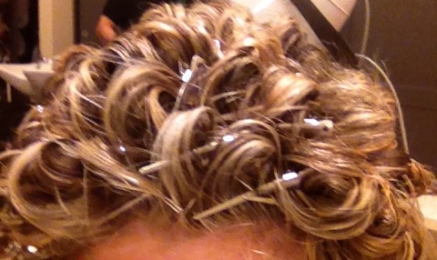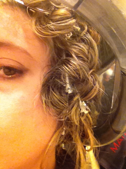 A questo punto i capelli vengono pettinati e si prende una ciocca abbastanza sottile alla volta, si piega ad anello e zac! con una forcina a becco d’oca si pinza alla sommità della testa. Si procede in questa maniera ciocca dopo ciocca, fino a pinzare tutti i capelli. Vi avviso che bisogna armarsi di santa pazienza, perchè è un lavoro lungo e noioso! Le ciocche vanno piegate ad anelli belli larghi, affinchè si crei un effetto molto voluminoso. Una volta terminato di attorcigliare ciocche, la mia testa appariva così: